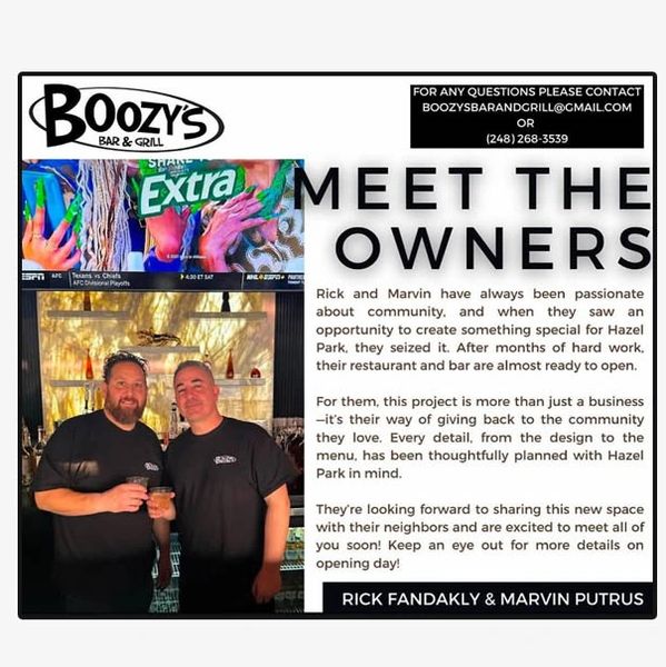 At Boozy's Bar & Grill, we pride ourselves on serving delicious food and drinks in a lively atmosphere. Established in the heart of the Hazel Park community, our mission is to provide a welcoming space for friends and families to gather.